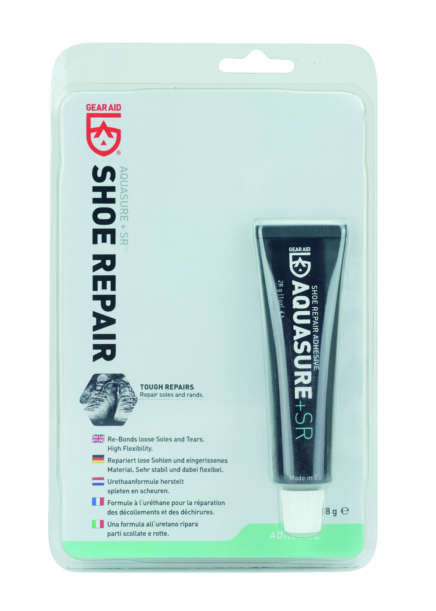 Gear aid Aquasure + SR Shoe repair je patentované lepidlo na báze polyuretánu určené na opravu a obnovu všetkých typov topánok a podrážok a taktiež ťažkých plachtovín. Lepidlo poskytuje opravenej podrážke pružné a veľmi pevné zlepenie, vodeodolnosť, odolnosť pri klimatických zmenách. Nemení sa pri pôsobení tepla a rozpúštadiel. Lepidlo sa minimálne zráža, preto na opravu postačuje iba jedna aplikácia lepidla. Je ideálne na opravu odlepených podpätkov, podrážok a iných poškodení na obuvi.